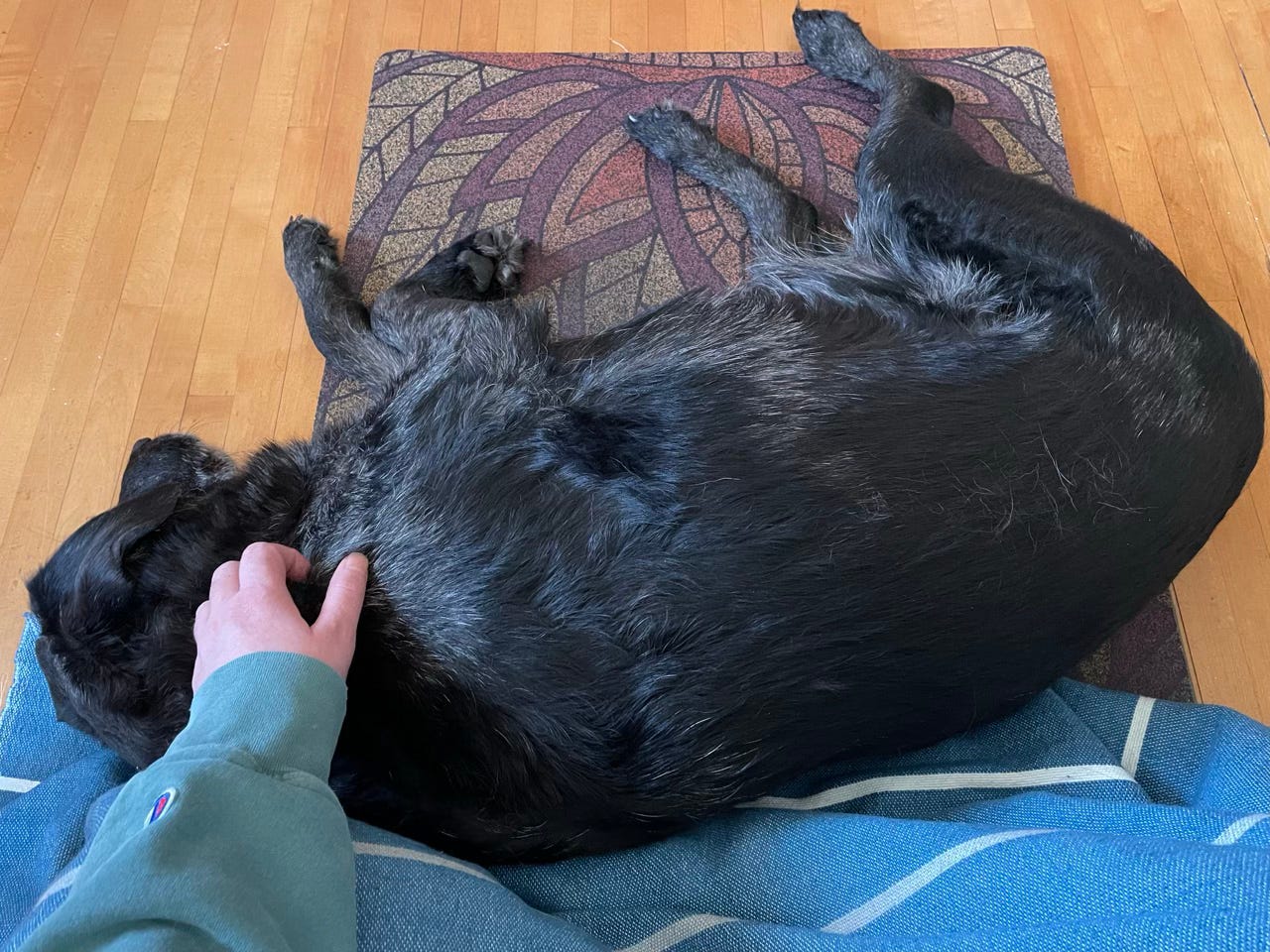 Our Cully dog has been joining me during my yoga practice this week. She likes that she can get attention all to herself. (Lewis is kenneled downstairs while I practice in the guest room upstairs.) I also think she notices the shift in my energy when I settle to the mat. Her own energy shifts too. She starts out insistent about getting pets, but as the mantra proceeds, she softens, lays down, places her head or paw on my crossed legs.